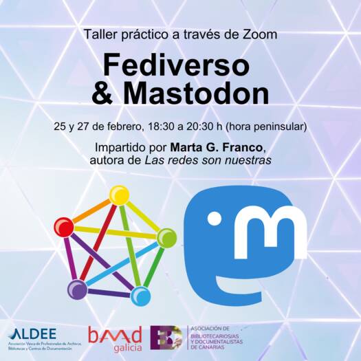 Este curso organizado con la colaboración de BAMAD Galicia, ByD Canarias y ALDEE, se centra en comprender y navegar por el Fediverso, un ecosistema de plataformas sociales federadas que operan bajo principios de software libre y protocolos abiertos. El curso será gratuito para personas socias/colegiadas de entidades FESABID que hayan suscrito el 2º Convenio de formación (será necesaria acreditar documentalmente esta condición) y el precio será de 20 euros para los demás (si quedaran plazas disponibles). Tendrán matrícula preferente las personas integrantes de ALDEE, BAMAD Galicia y ByD Canarias.