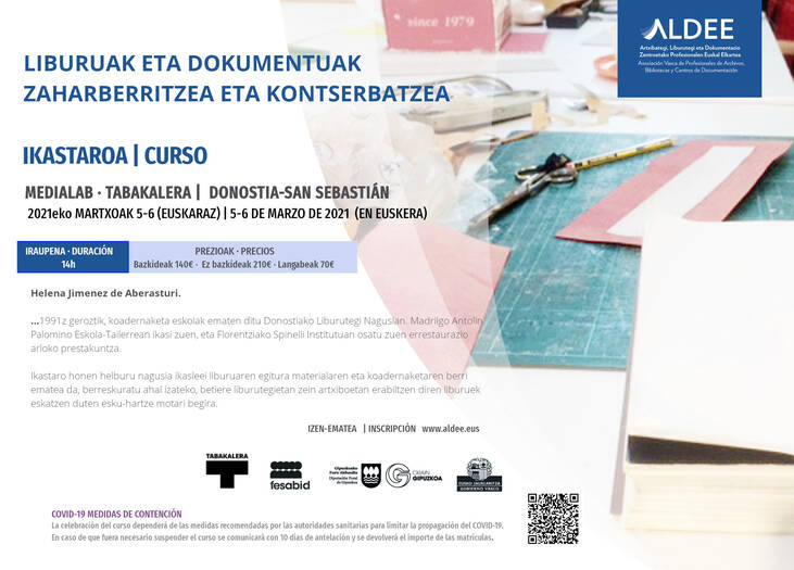 Es un taller para aprender a realizar las primeras intervenciones de libros en mal estado que se recogen en una biblioteca o archivo. Por ello está dirigido a personal de bibliotecas o archivos. Se tendrán en cuenta las necesidades de una biblioteca o archivo, ya que cuando los libros se utilizan tanto, los lomos o las hojas se sueltan y es importante que la primera intervención se haga con unos conocimientos concretos.
