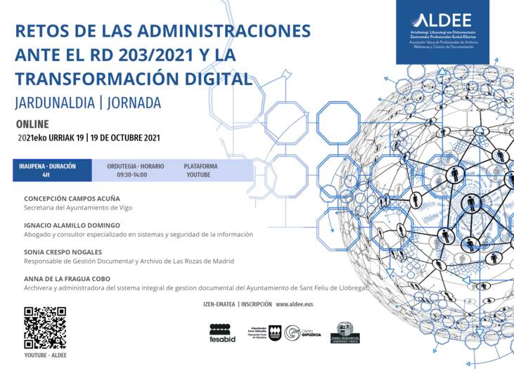 El 19 de octubre ofreceremos nuestra primera jornada profesional 100% online. Para ello contamos con cuatro grandes profesionales en este ámbito: Concepción Campos Acuña, Secretaria del Ayuntamiento de Vigo; Ignacio Alamillo Domingo, abogado y consultor especializado en sistemas y seguridad de la información; Sonia Crespo Nogales, Archivera del Ayuntamiento Rivas Vaciamadrid y Anna de la Fragua Cobo, archivera y administradora del sistema integral de gestión documental del Ayuntamiento de Saint Feliu de Llobregat.